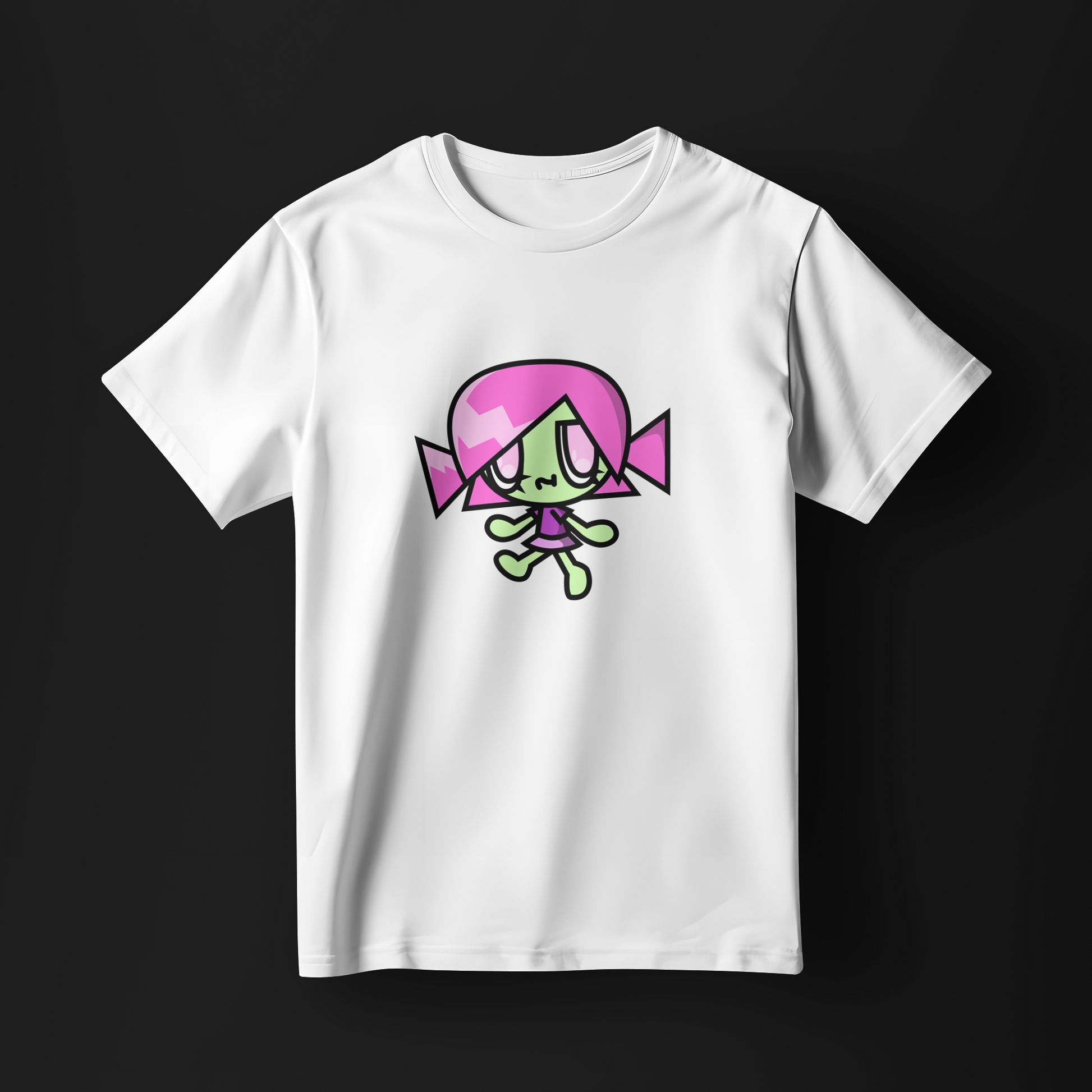 Un design jucăuș și vibrant ce înfățișează o fetiță stilizată în nuanțe de roz aprins și verde lime, cu influențe de artă pixelată și cartoon modern. Ideal pentru iubitorii de estetică kawaii, gaming retro și designuri amuzante și expresive.